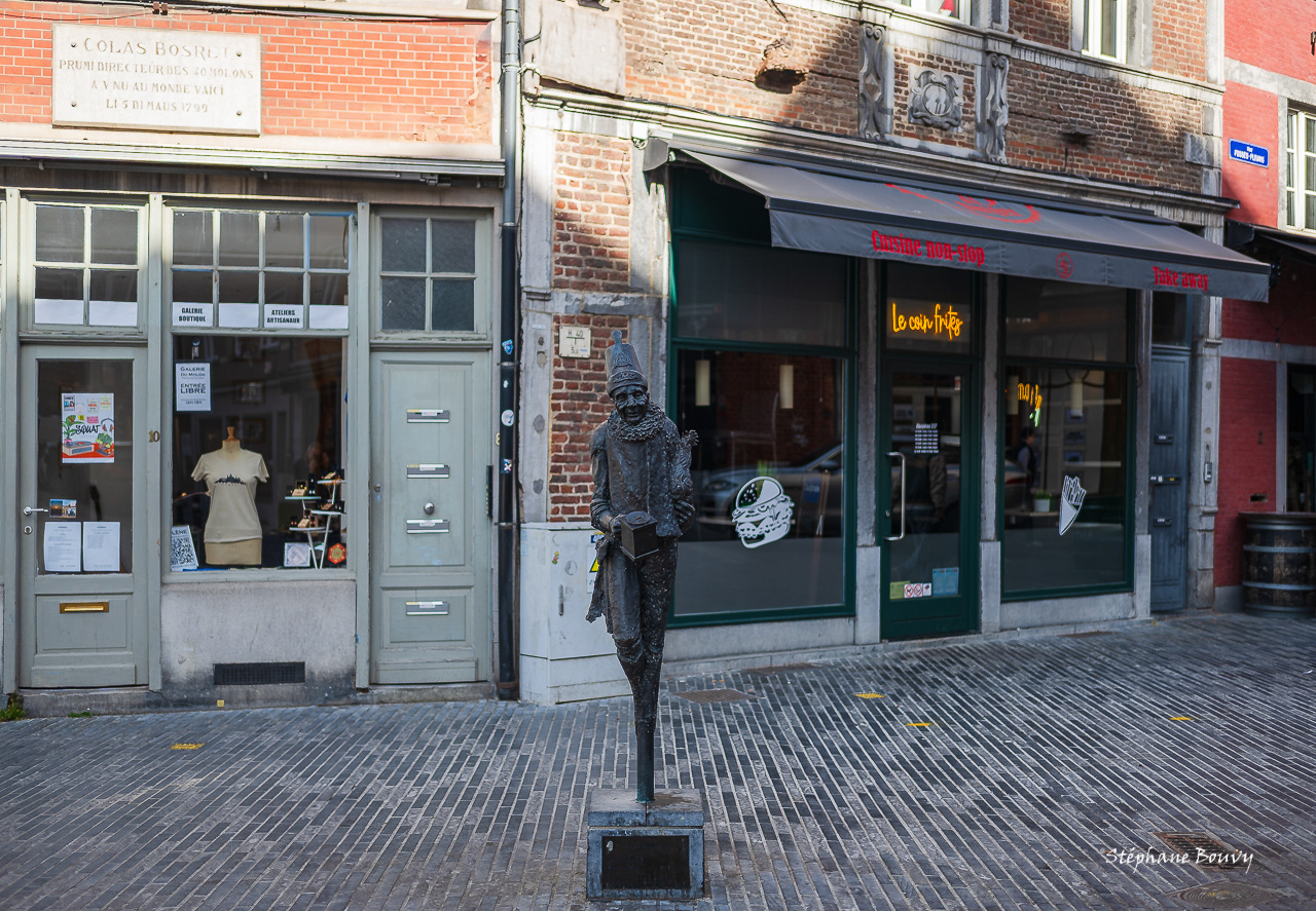 Statue amusante du molon, personnage emblématique du folkore namurois, devant la maison natale du poète Nicolas Bosret, premier président de la confrérie des 40 Molons qui existe toujours aujourd'hui...