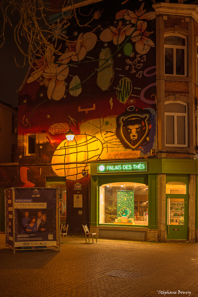 Dans le piétonnier, la nuit du réveillon de Nouvel An, cette enseigne, ce panneau et ces deux chaises intriguent...