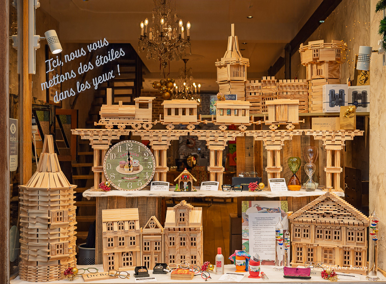 Vitrine de Noël d'un opticien sur la place du Marché aux Légumes.